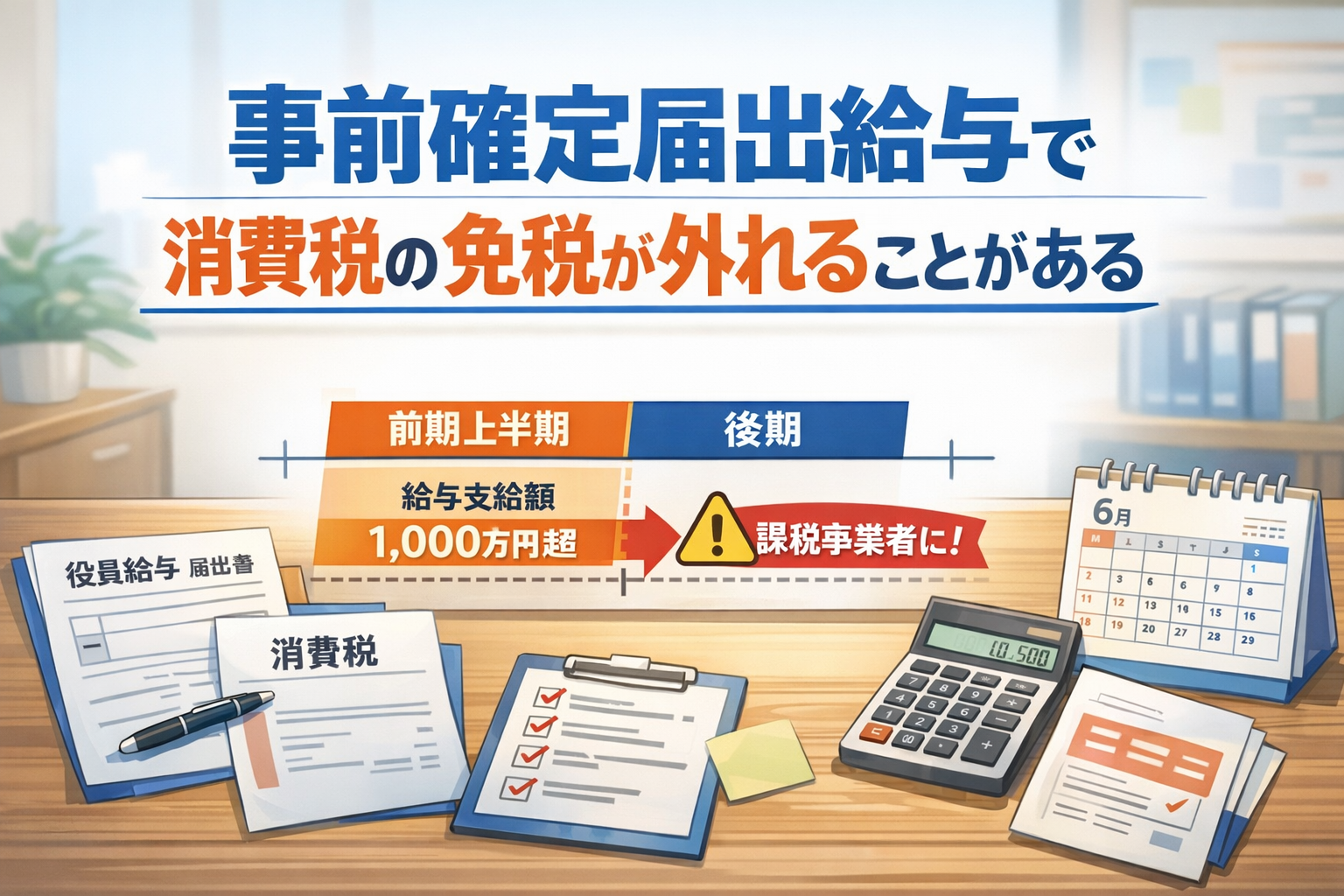 事前確定届出給与を検討するときは、法人税だけでなく、翌期の消費税の納税義務判定まで一度並べて見るのが安全です。