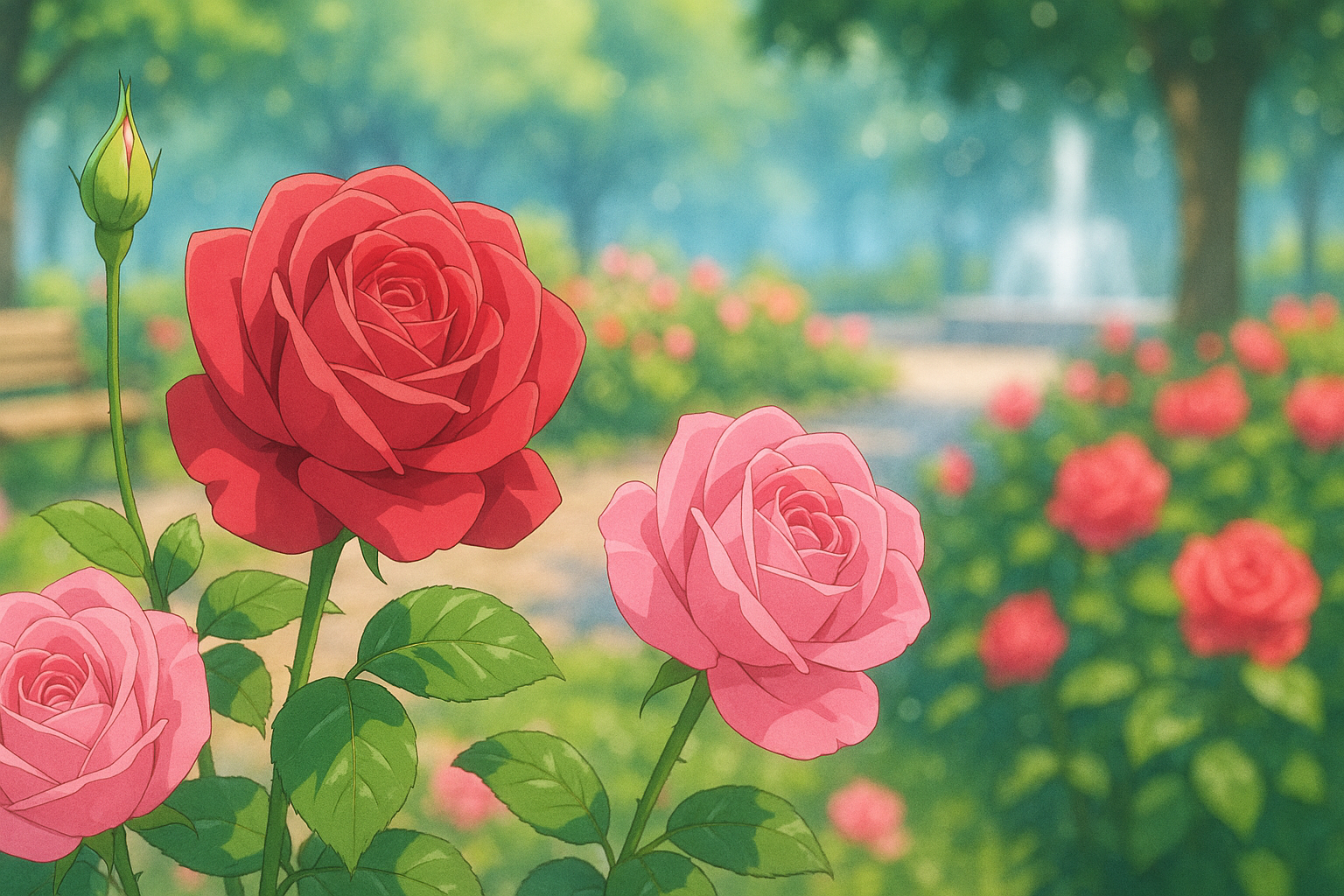 バラ園に近づくと、見事な花々が迎えてくれました。整然と手入れされた花壇に、色とりどりのバラ。朝のやわらかな日差しに照らされて、花びらがほんのり透けて見えました。