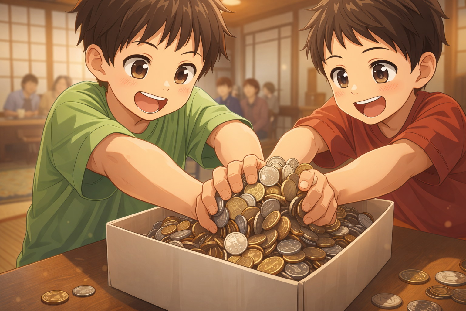 従兄弟同士の仲が良かったこともあり、それぞれの金額を数えたあと、最終的には合算して山分けしていました。硬貨を種類ごとに分け、積み上げ、合計額を確認する過程そのものが、何より楽しかった記憶があります。